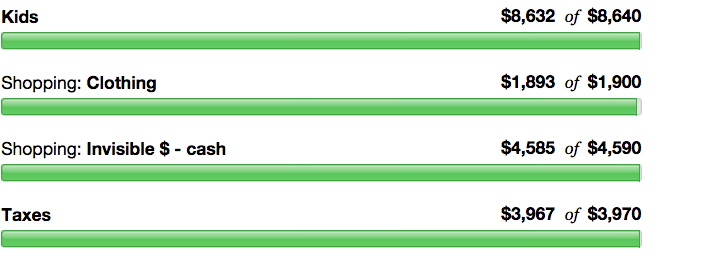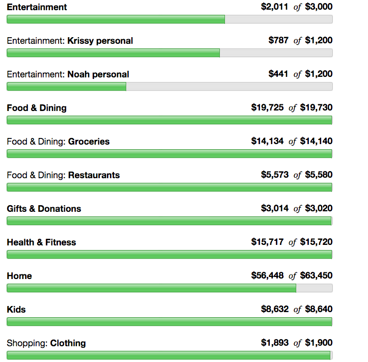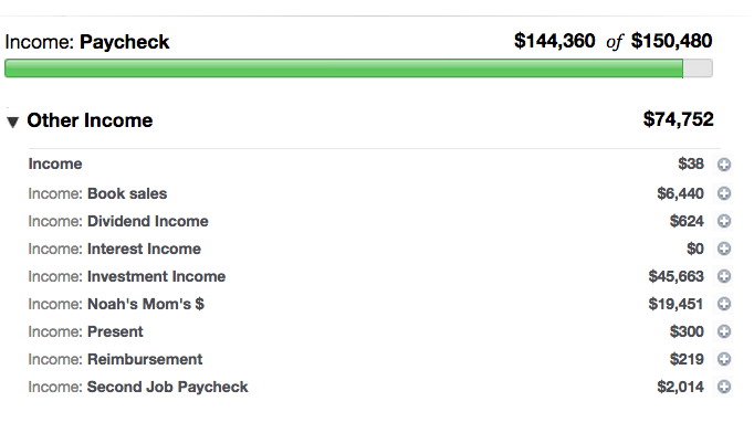 Right away you see how things look funky. It looks like Noah got less in his paycheck than I expected, but that isn’t so! Really what happened is he got a bunch of unexpected money and I spent pieces of it and there is no way to put that in the budget without bumping up the paycheck section. I don’t like this tricky way of trading accounting, but given that his extra income is a full $68,633 over and above our spending for the year I am having trouble properly flogging myself for going over his base income. I mean really, that’s a full time job of income I didn’t even count as income in our budget. It’s ok that I fudged into it.